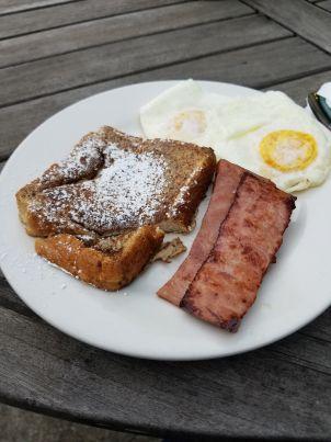 After showering, I went downstairs to partake in the breakfast the front desk clerk, I made my reservation with, raved about. As we entered from the back, the ladies in the kitchen saw Lily and said she could not come in. Prior to doing anything, I read the paperwork for the room and one of the things that were mentioned was dogs could not be left in rooms unattended. Based on that, I wasn’t sure what to do. I was told I could eat on the patio and was asked for my order. They had eggs (I asked for over easy), turkey bacon, and French toast. The meal came out quickly and was tasty and not over filling.