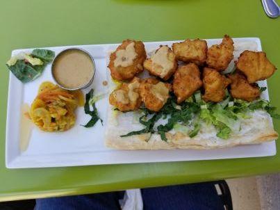The sandwich arrived and looked tasty. The slaw, on the other hand, was not what I was expecting. It was curried, which I was happy about, but it consisted of yellow squash and chickpeas. I’m not the biggest chickpea fan, but it tasted just fine. I asked for hot sauce to go with the poboy, not realizing that the container in the center was of a seasoned drizzle. I added that and ate. It was a mess, as poboys are, but fit the criteria of different, spiced – but not hot, and garden based with a NOLA taste. I ordered beignets to go because the wind was picking up and it would have been a bigger mess than usual. The waitress filled my cup with hot water and had my beignets out pretty quick. Although the food was good, and it was super busy inside, the server was super slow. I understand why and am not offended by it, but if I were in a rush, this would have been an issue.