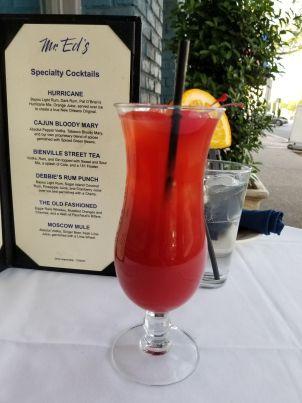 I went to the place around the corner from where I stayed. Mr. Ed’s Seafood & Oyster House was a bit fancier than I expected, but I read they were pet-friendly, and didn’t require me to tie my dog outside while I ordered like VooDoo BBQ did across the street. We started to walk in, as a couple and I feigned fighting over the door. I opened it and a hostess and server came out to look at Lily, and probably stop us from going in. I asked about one of the seats outside and they were happy to give it to me. They shook the tablecloth off and gave me a menu. Charles came out and took my drink order. I mentioned his name was Charles and we were on St. Charles because he mentioned his name several times as if I might forget it. I ordered a hurricane and checked the food menu. He came back with the drink and I told him what I was interested in but mentioned my allergy. He said the gumbo, jambalaya, and etouffee were all out of the question. As those were my three favorite Cajun meals, I was a bit disappointed but expected it. I asked about the Pasta Orleans and another dish, with the redfish as a last resort. He came back and said the Pasta Orleans would work.