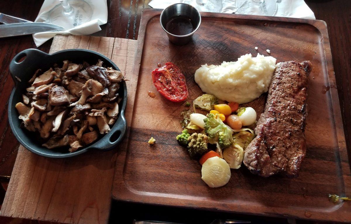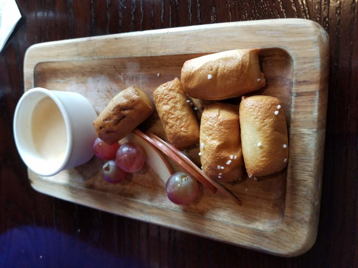 While we waited for the appetizers, two types of rolls were brought to the table. The options were cheddar and poppy seed. The cheddar was precisely what you would expect without mentioning a competitor, and the poppy was okay. The butter was soft and smooth to spread, unlike some of the more recent venues. When the soup arrived, I used the second half of my poppy roll to dunk. I intentionally waited for my soup to cool, instead of my slurp and burn method. The soup had a Cognac base with all the onions on the bottom. It also had two crostinis, of which the second was not noticeable until I hit the bottom. Probably didn’t need the roll. Because this soup was based different than the other two I had during this year’s Magical Dining, I can say I am a bigger fan of the cider base. As everyone else had the fondue, I was happy I opted for the soup, if only for the variety. The fondue came with apple slices, grapes with seeds, and pretzel bites. It looked enticing and might be worth a trip back, as their regular menu looked very enticing. I was particularly impressed with their steak prices.
