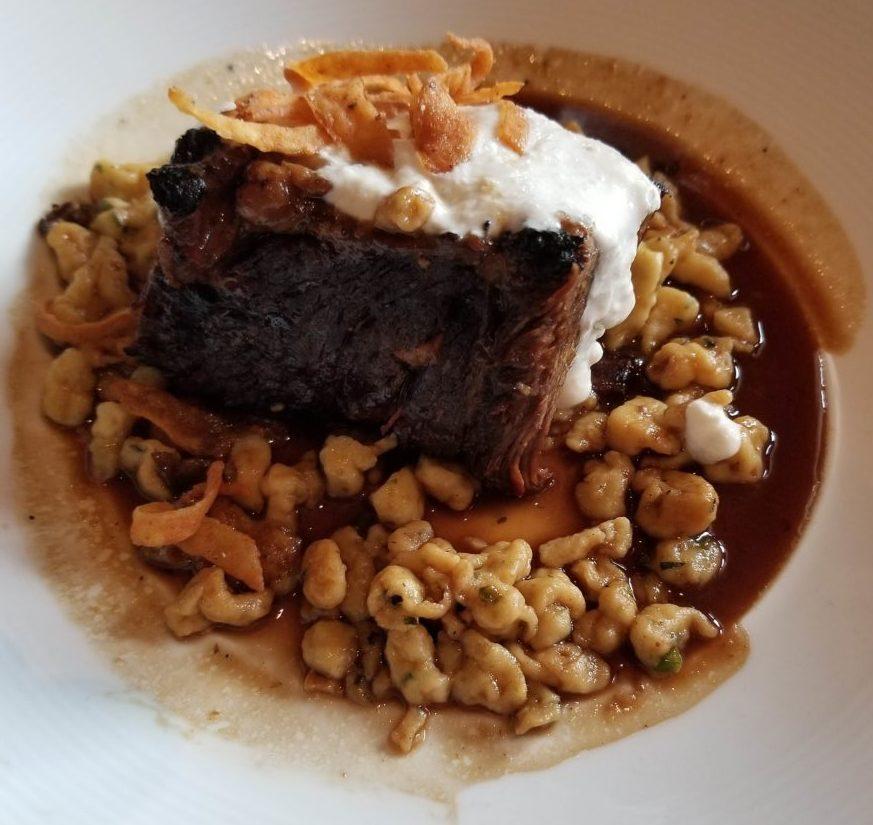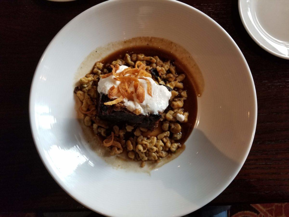When the entrées arrived, I again was the odd one out. Everyone else got the 10oz strip, and I got the short ribs. I wanted to have them to compare with the one I had at The Grill. This was topped with a horseradish cream sauce and surrounded by spaetzle. We were told the meat was braised for 5 hours. It was fork tender and melted in my mouth. I preferred this compared to the other one I had the week prior. The meat was a better cut and less fatty, and therefore, less greasy. The sauce, though, was sourer than I would have liked. I tolerated it but would have enjoyed it more had it not been there. Everyone loved their steaks and accompaniments. Someone substituted the red wine reduction for bearnaise, while someone else ordered mushrooms on the side. I would have had some of the mushrooms but did not think it would go with the sauce. I was also trying not to get sick from overeating.