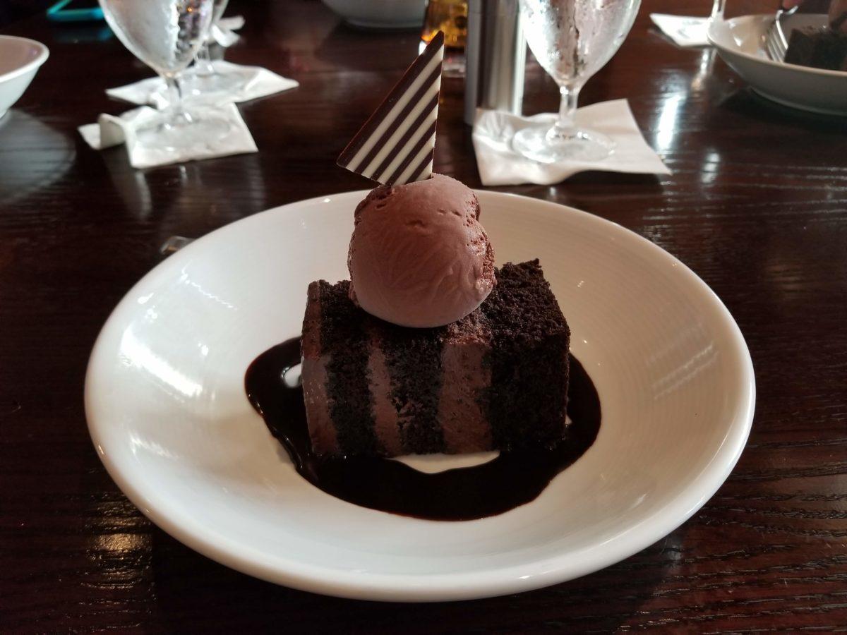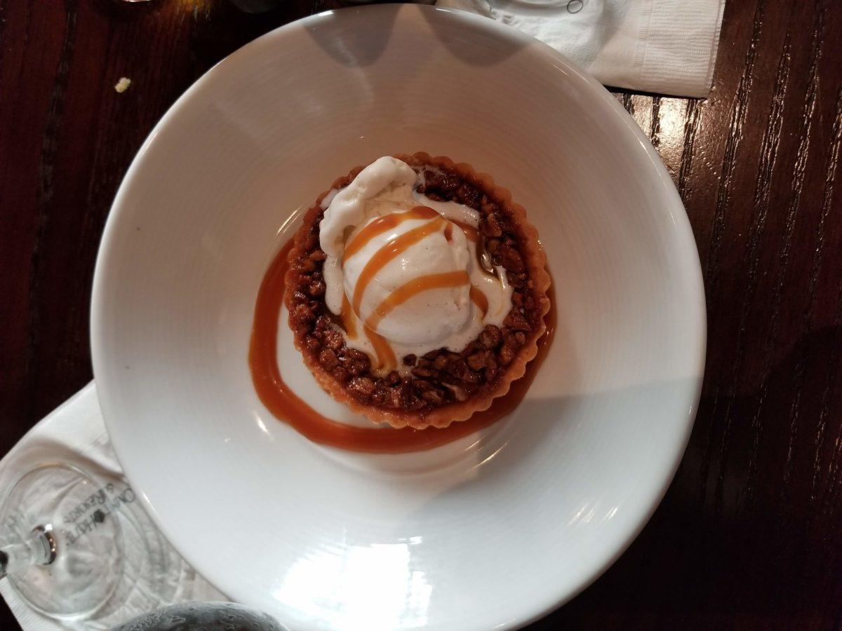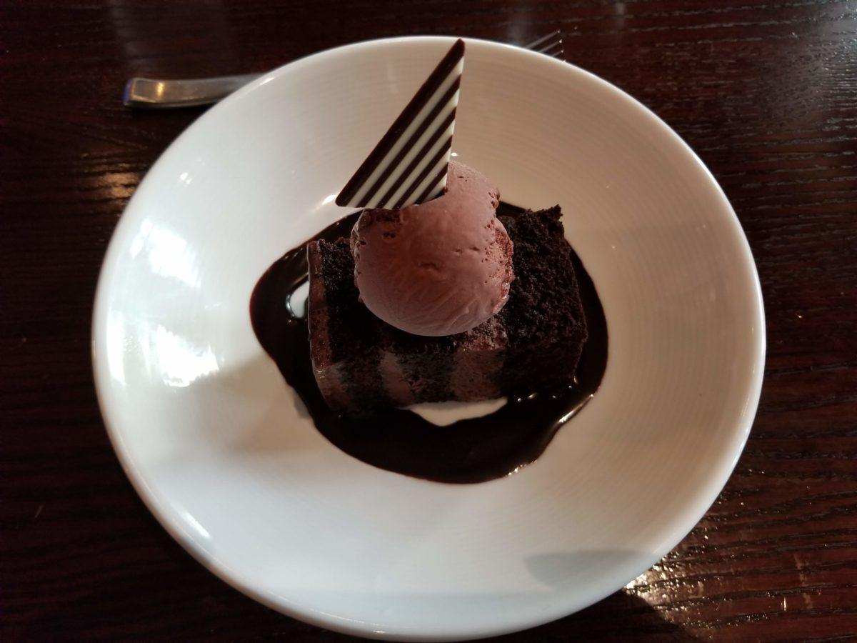 Not being the odd man out this time, I was one of the three that ordered the Chocolate Decadence. Appropriately named, it was a chocolate layer cake filled with double chocolate icing in the center and another layer on top. That was topped with ganache and chocolate gelato and circled with a thick layer of chocolate sauce. Apart from something I would make and the Killer Cake at Two Jays, this might have been the most chocolate I have eaten in one sitting. The other dessert that as ordered was the pecan pie and it was complimented. I am not a fan, but I’m glad my friend enjoyed it.