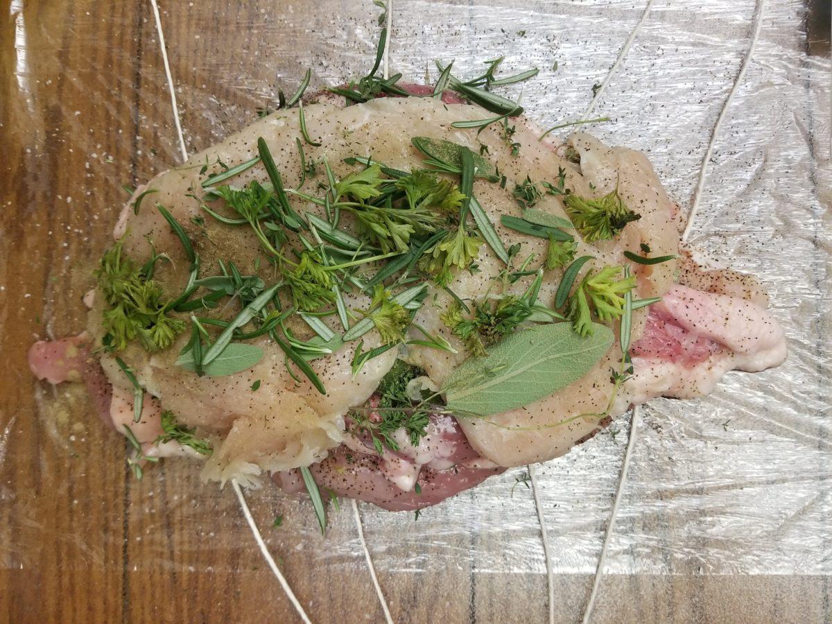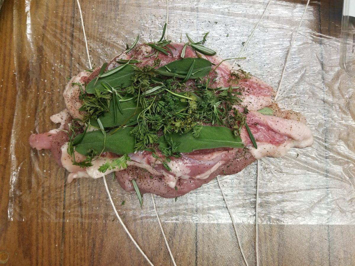 So I flattened the meat to cook even, but because I was sous-viding, it would cook evenly. That also allowed easier rolling of the bird in a bird in bird configuration. Between each layer, I added the classic poultry blend of rosemary, sage, and thyme. I used fresh herbs and added parsley just because it sounded so much better: parsley, sage, rosemary, and thyme.