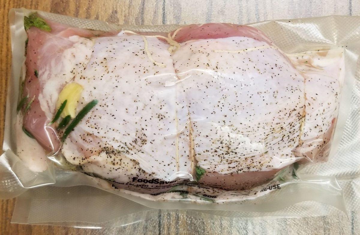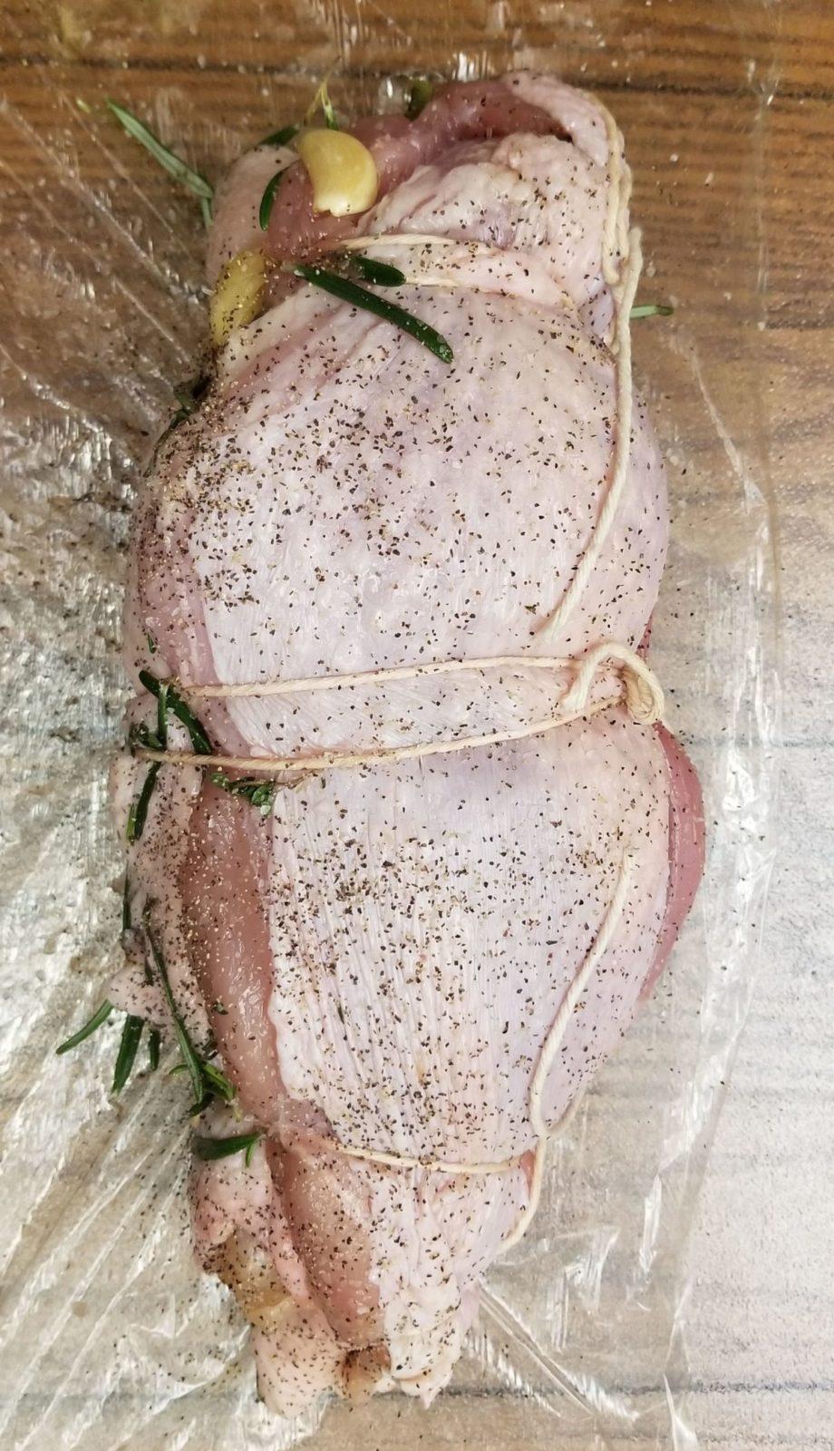 Once finished tying, I placed in a Food Saver bag and sealed. I prepped the entire thing a day before and refrigerated.