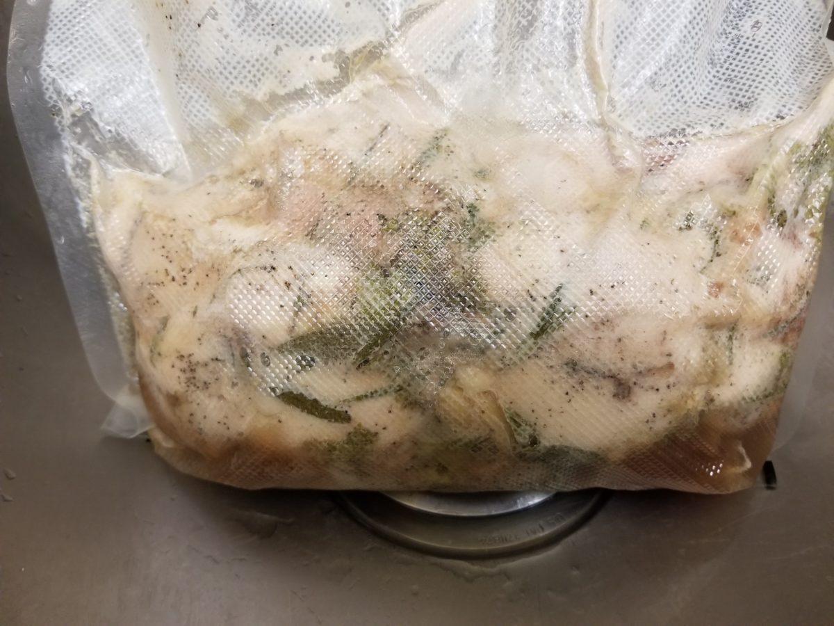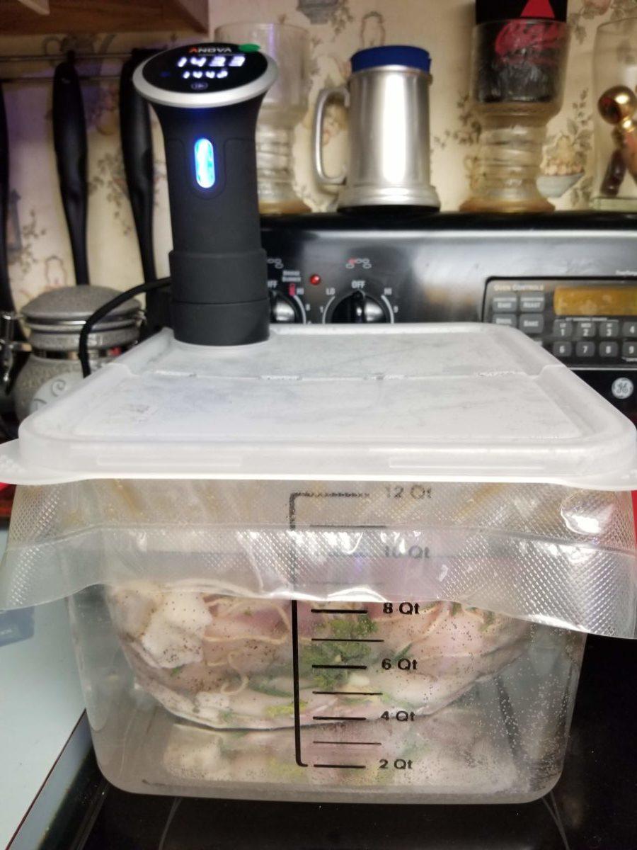 I read someone said 62C and I converted it to 144F. Deciding to go a little higher, I made it 144.2F. I also added the meat from the refrigerator and into the bath. I covered with a lid I purchased and started the cook. It was supposed to be for five hours based on the temp, but with all the variables and the fact that I was distracted making the sides, I let it cook longer. It came out to a little over six hours. If someone is trying to emulate this, I suggest 6.25 hours.
