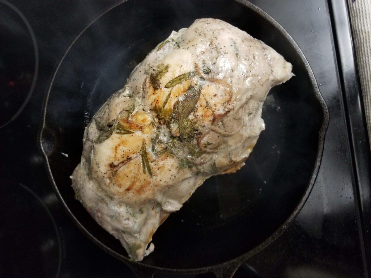 After I finished making another side and letting the bird sit while my cast iron pan heated, I added some bacon fat to the pan, as I always keep some handy for added flavor. I used enough to coat the pan and added the bird-thing. Using tongs, I seared each side for about 30 seconds, or until I felt it seemed sufficient. It was more a feeling than a time. When it was golden brown, I flipped, making sure to get all exposed areas.