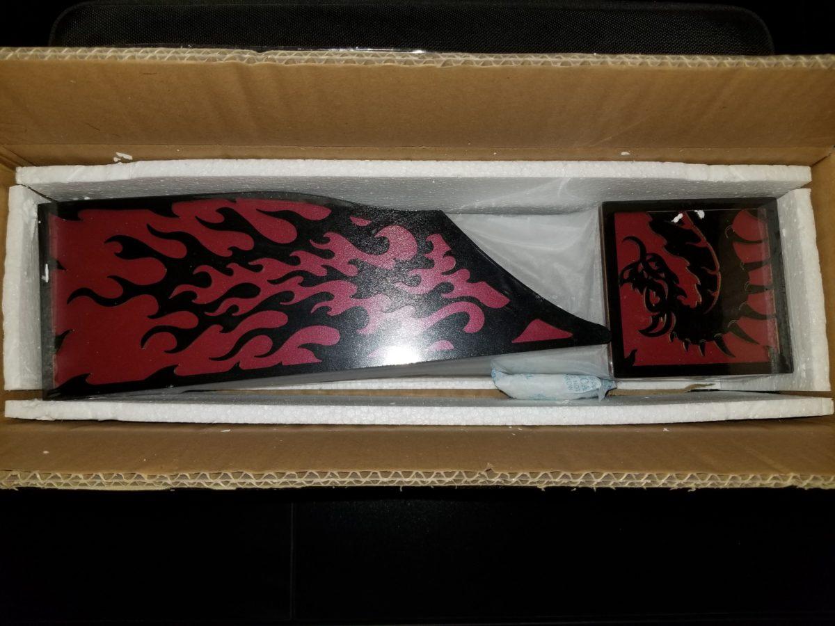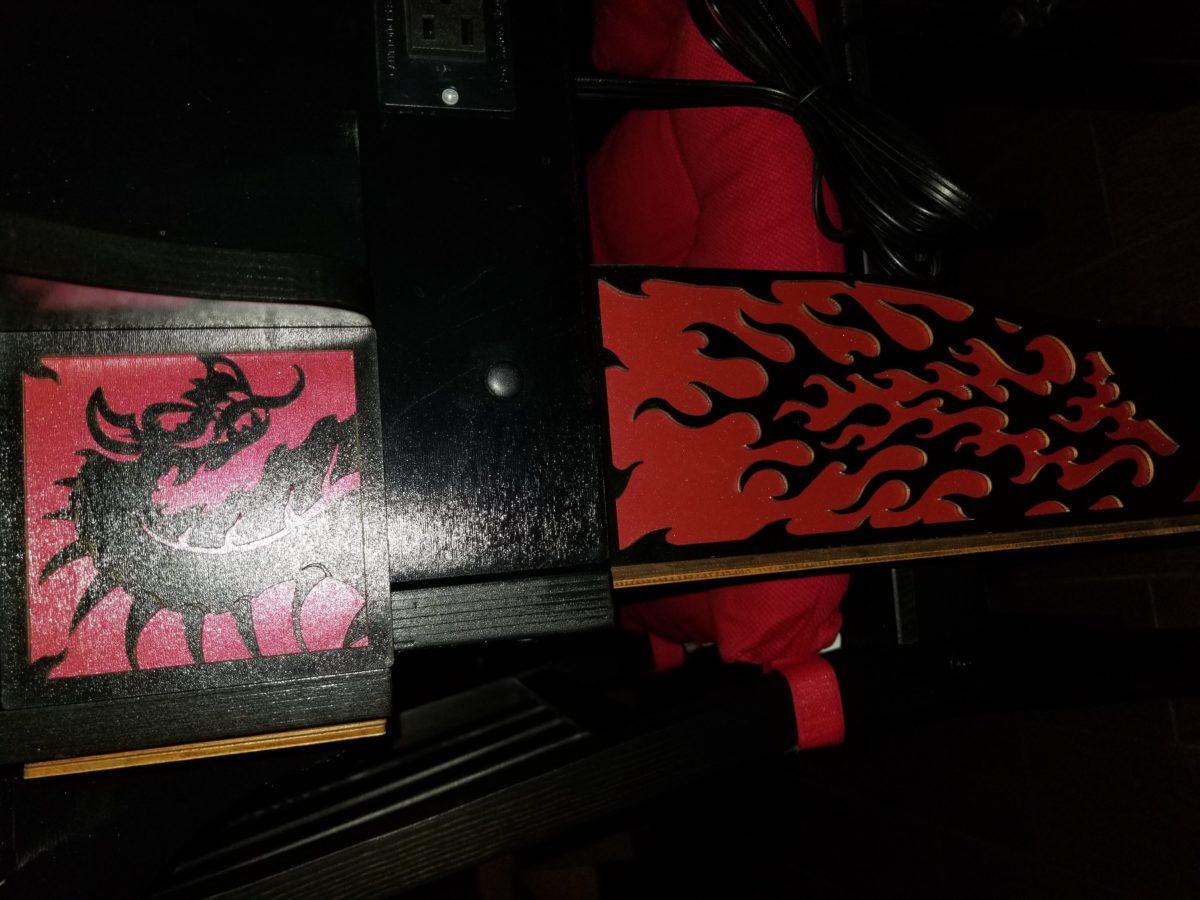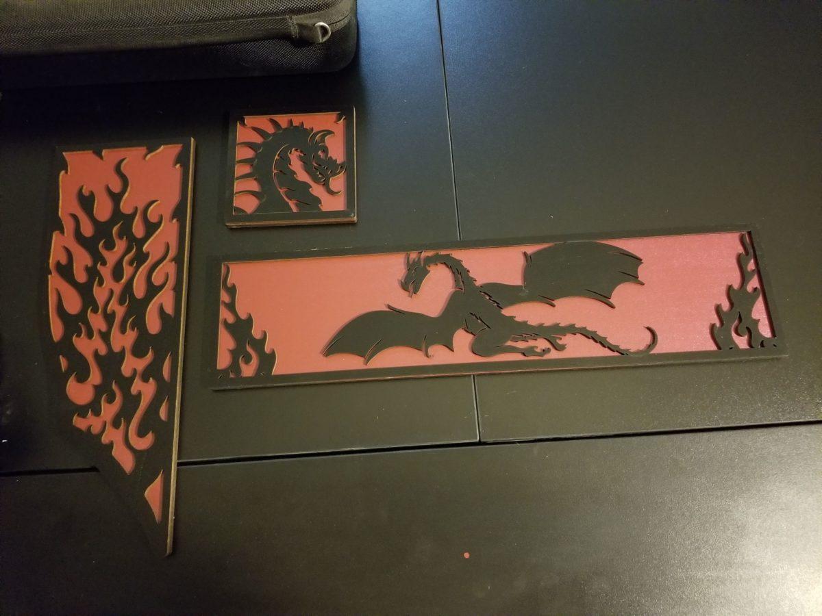 I pledged for a dragon deco pack that matched the table, so it was black dragons on a red background. When I got the pack, I discovered the plywood, much less quality than the table itself was actually a red wood that was painted black on the foreground. The paint was not the same as the one used on the table. The table is really impressive and of a solid build not so with the deco. It seemed less quality and really not impressive. The color of the wood is also off compared to the color of my read mat. The mat is true red while the deco is more of an off burgundy.